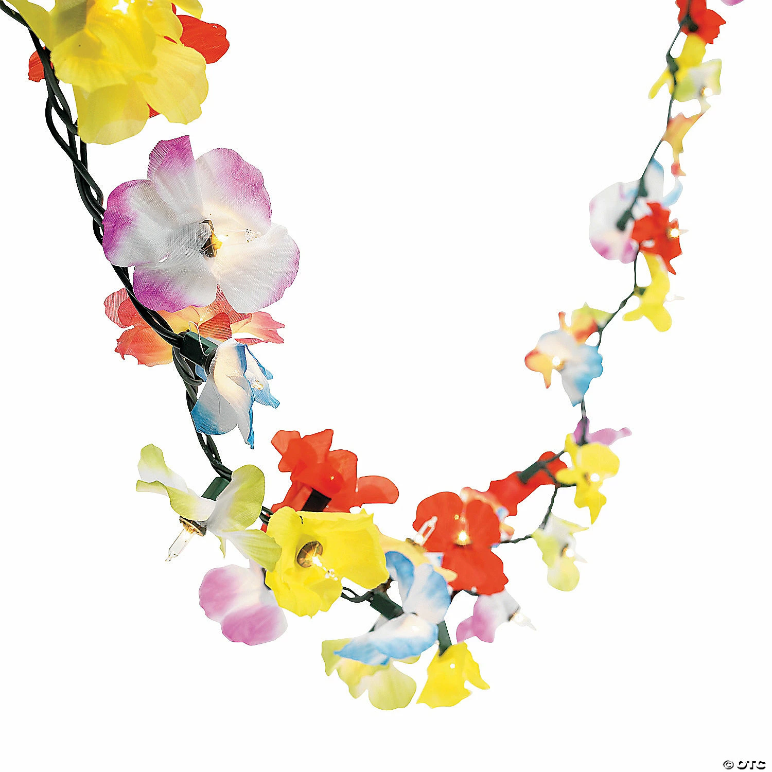 This floral garland is a great luau decorating idea! Hang these string lights around the Hawaiian party’s entrance, from cabanas, fences or porches. This polyester floral garland lights up with 50 assorted 2 1/2″ lights. Each tropical garland will add an island feel to your dΓ©cor. 11.5 ft. 6″ Light sets interconnect. UL listed. For indoor and outdoor use.
