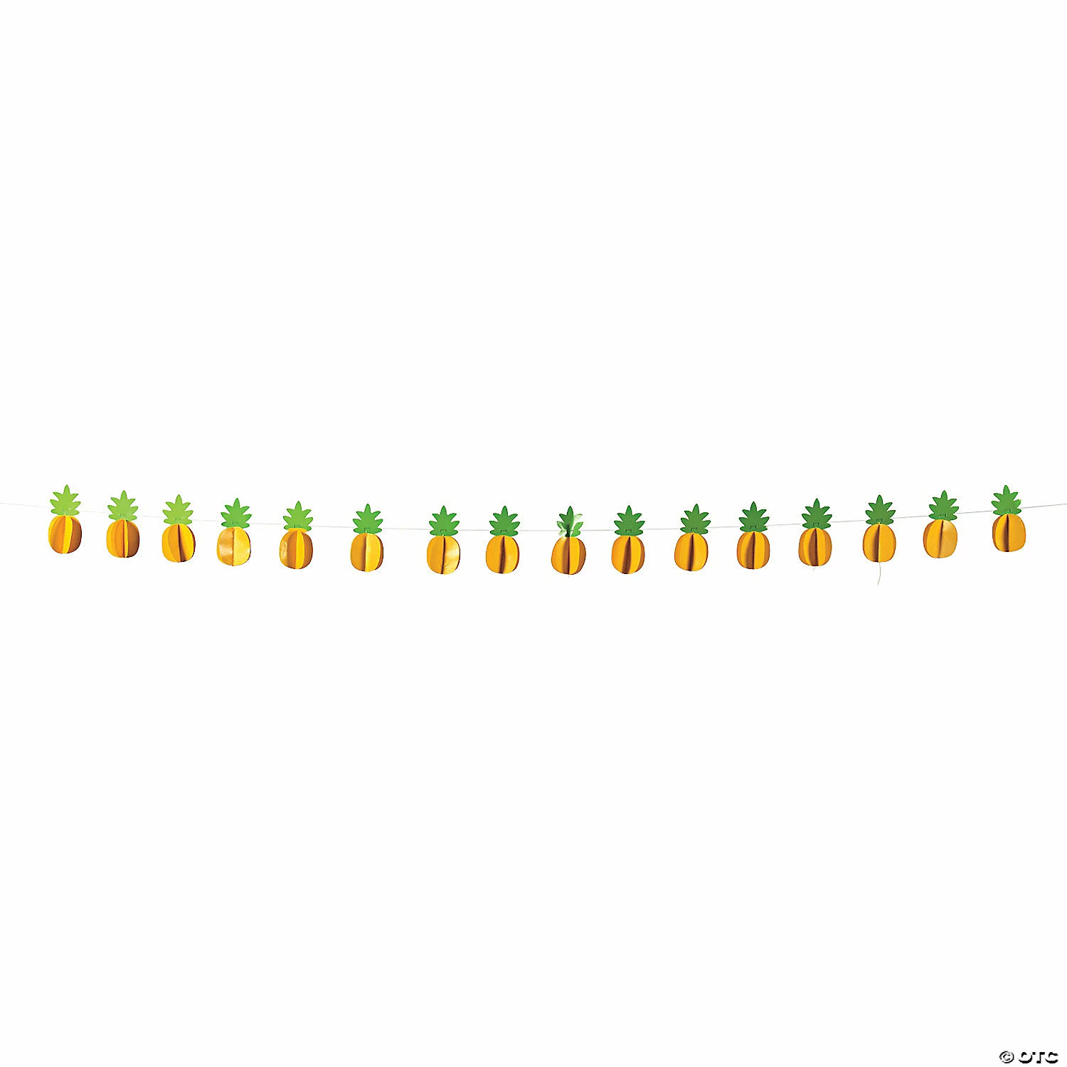 This garland is a tropical treat – line your luau with these precious pineapples! A cheery decoration for a fun night of hula dancing, it’s a fun way to add flair to your tiki bar. Hang it above the door to the party room to let everyone know where the frosty drinks and beach party treats are! Paper. 8 ft. clear wire with 2″ x 4″ pineapple pennants. ยฉ OTC
