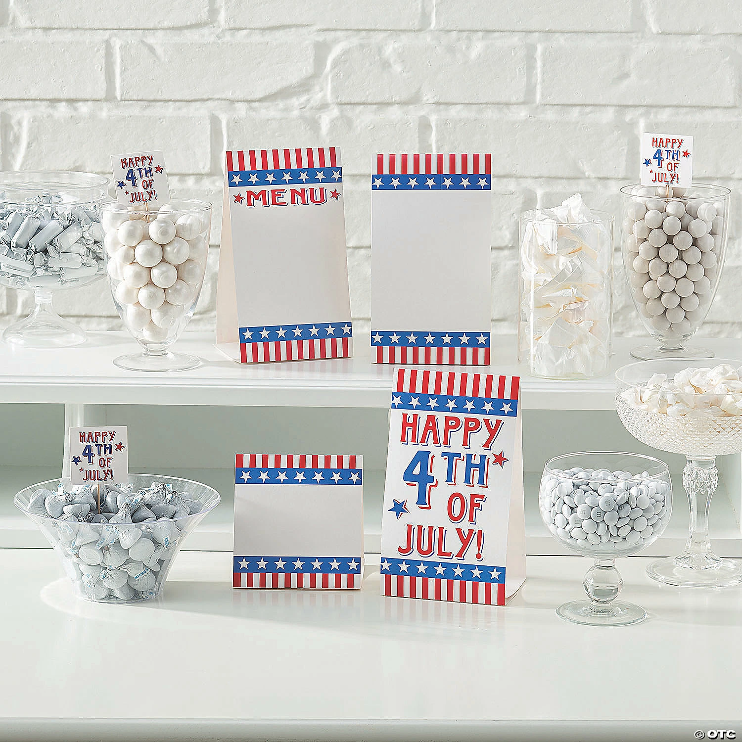 Everything you need to decorate a patriotic food spread at your next 4th of July party or Memorial Day event, this buffet decorating kit includes tent cards to what what dishes are and food picks to add a little patriotic spark to your party décor. Cardstock. Includes three 8″ tent cards, three 4 3/4″ tent cards and six 5″ picks. © OTC