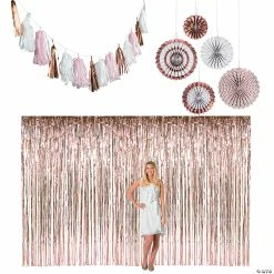 Rose gold symbolizes style and elegance, making it the perfect theme for a wedding reception, anniversary dinner, engagement party or any other sophisticated event. Make decorating for a rose gold-themed event easier with this decorating kit. Featuring hanging fan decorations, a fringe backdrop curtain and more, you can be sure your rose gold party decorations will match when you buy them all together in this kit. (7 pcs. per unit) Assortment may vary.Includes:• 1 Plastic and paper Blush & Rose Gold Tassel Garland (6 ft. x 6″)• 1 Rose Gold Foil Hanging Fan Assortment (5 pcs. per set. Includes two 10″ diam. fans, two 8″ diam. fans and one 6″ diam. fan.)• 1 Foil Large Rose Gold Metallic Fringe Backdrop Curtain (12 ft. x 8 ft.)