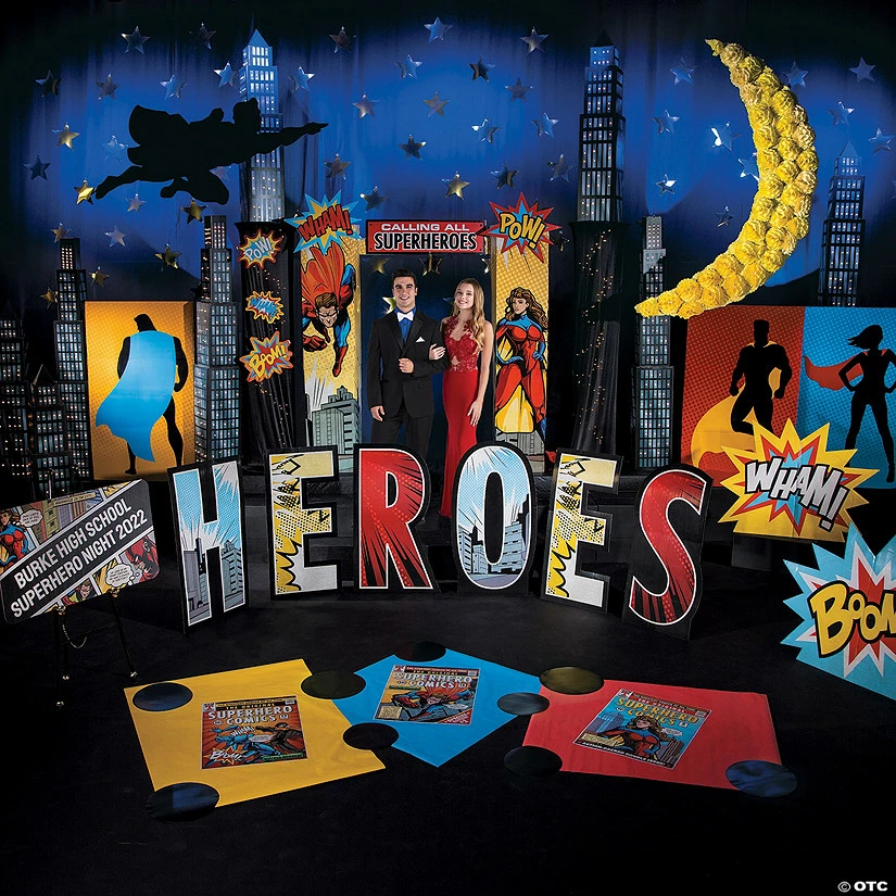 Get the superhero party started with these large classic comic book party decorations that are sure to save the day at proms, homecomings, corporate events and charity fundraisers. Includes:โข 1 Cardboard Arch Connector (50″ x 18″)โข 3 Vinyl Superhero Wall Clings (23 1/2″ x 32″)โข 2 Cardboard Superhero Explosion Word Stand-Ups (55″ x 43″)โข 2 Cardboard Female Superhero Column Stand-Ups (19″ x 19″ x 94″)โข 2 Cardboard Male Superhero Column Stand-Ups (19″ x 19″ x 94″)โข 3 Cardboard Superhero Silhouette Wall Panel Stand-Ups (44″ x 6 ft.)(13 pcs. per unit) Stand-ups are one-sided with a brown cardboard back. Assembly required. Assortment may vary. ยฉ OTC